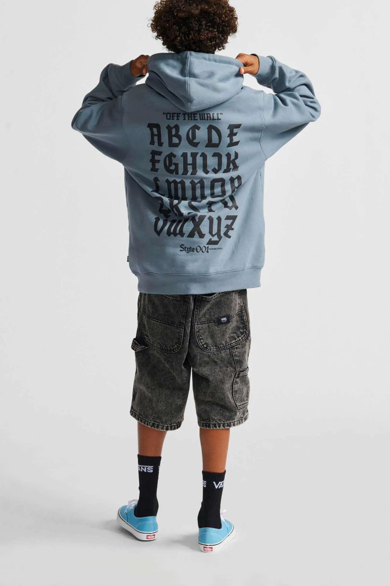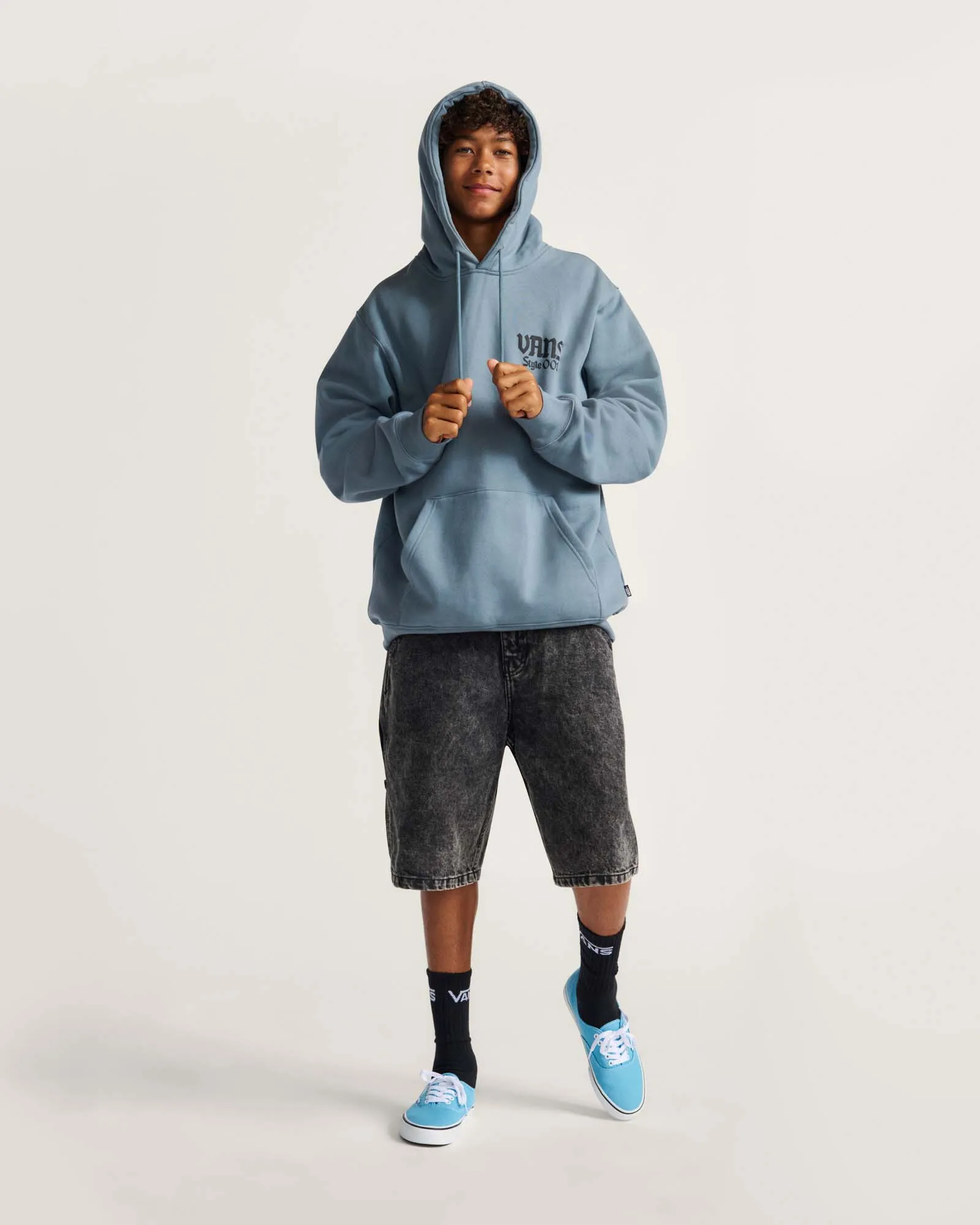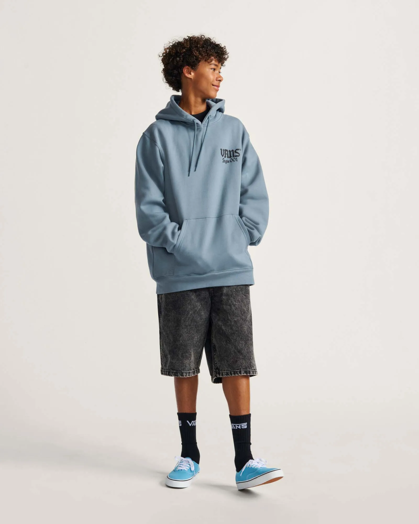 Суитшъртът Style 001 Pullover Hoodie съчетава семпъл дизайн с мека вътрешност за комфорт и топлина. С преден джоб тип „кенго“, той е завършен с графика, включваща стилизирано лого на Vans отпред и диаграма с азбучен шрифт Off the Wall отзад. Носете го самостоятелно или върху други слоеве за допълнителна защита от атмосферните условия.